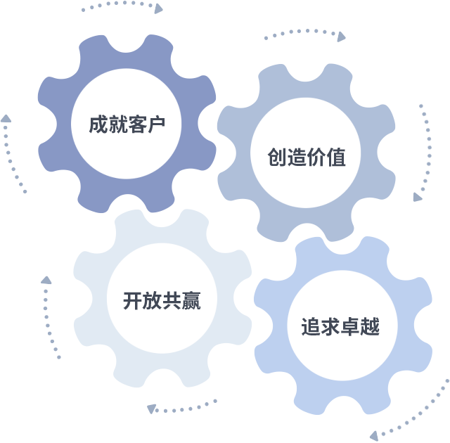 成就客户是一切决策的出发点,,,创造价值是衡量所有工作的标准,,,,追求卓越是我们做事做人的态度,,,,开放共赢是我们的格局也是最终的结果。。价值观的齿轮环环相扣,,,,推动着组织里的每个人不断向前。。。。